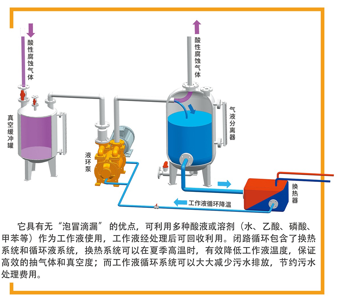 耐腐蝕液環(huán)泵可以升級為閉路循環(huán)系統(tǒng),它由FSK系列、F2SK系列、F2BV系列、F2BE系列和JZJFS羅茨泵系列,與真空換緩沖罐、汽液分離器、換熱器、連接管路等串聯(lián)組成。閉路循環(huán)與用戶DCS 連接可實(shí)現(xiàn)自動(dòng)控制。